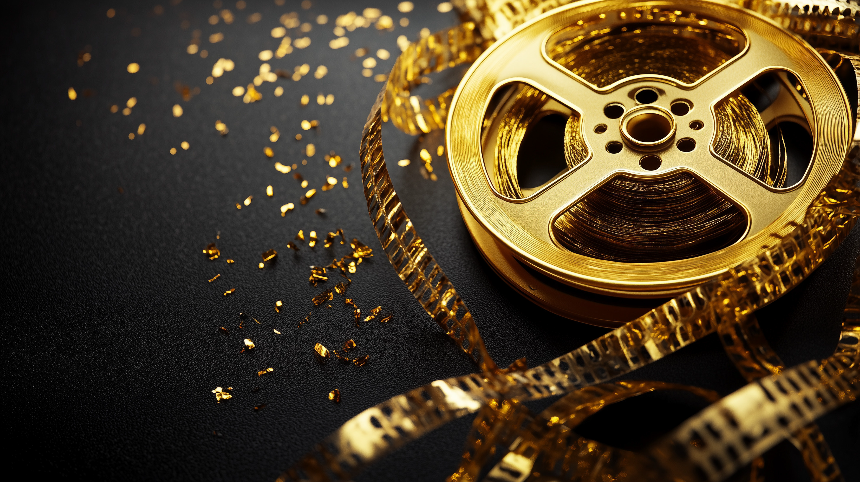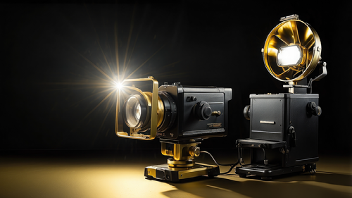 Created with images by Ashan - "Spot light, strobe lighting, overhead lighting, gold movie camera, and black background" • Digital Artist - "Extremely close-up digital sketch in macro, with loose brushstrokes and a hazy ambiance. shows a golden photography gift set that includes a tripod, lens cleaner, and camera strap. Reflections with ir" • AI.noevation - "Golden Film Reel with Confetti Luxury Movie Production Concept" • chayanit - "Money coin in hand black and white photo on black background - Black and white photo of coins in old wrinkled hands close-up" • Petr - "A captivating camera lens surrounded by sparkling lights and water droplets symbolizing creativity" • Pawel - "camera on black background" • TheoTheWizard - "A long strip of film with a lot of dust on it" • Gary - "3d rendering of gold and black abstract geometric background. Scene for advertising, technology, showcase, banner, game, sport, cosmetic, business, metaverse. Sci-Fi Illustration. Product display"